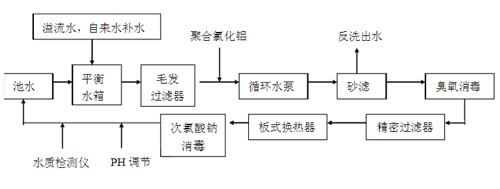本設(shè)計(jì)泳池的進(jìn)回水方式,采用淺水端池壁進(jìn)水、深水端池底回水和池面排水相結(jié)合的順流循環(huán)方式,采用這種方式,既能有效去除沉積于底部的污物,又可去除浮于水面的毛發(fā)及其它輕質(zhì)漂浮物。保證了全池水質(zhì)的均勻。工藝流程圖如下圖所示: